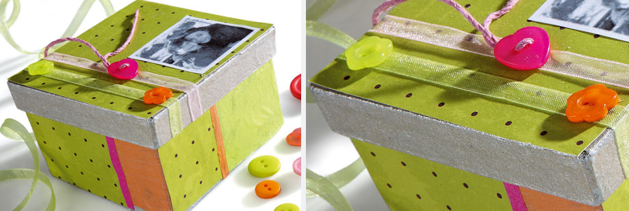 A l’aide du roller de colle, l’enfant colle la/les photos à l’endroit souhaité sur la boîte.