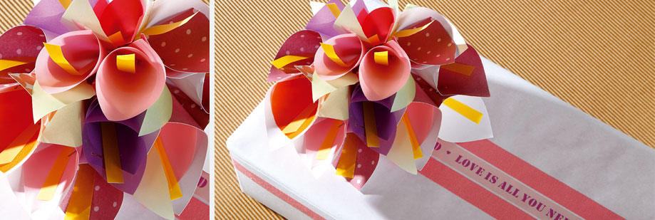 Vous pouvez ensuite coller le bouquet pour agrémenter un paquet cadeau et le décorer ensuite, avec les rubans, selon vos envies.