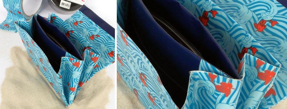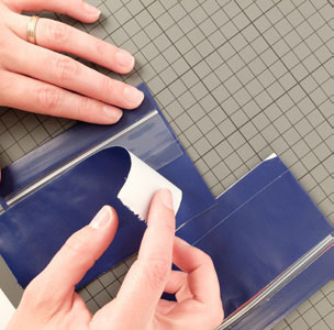 • Coller le zip sur le haut des morceaux D et E, en camouflant le plastique à l’aide des bandes prédécoupées. Superposer deux bandes de queentape.