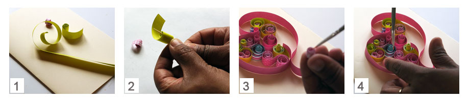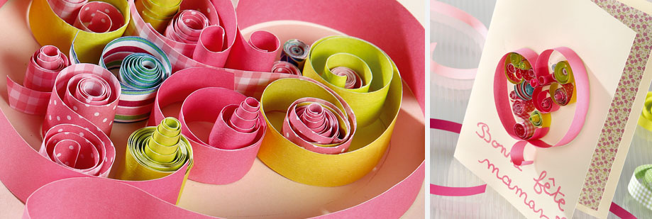 • Former un cœur avec une bande de papier pour quilling et le coller sur la carte à l’aide d’un pinceau.