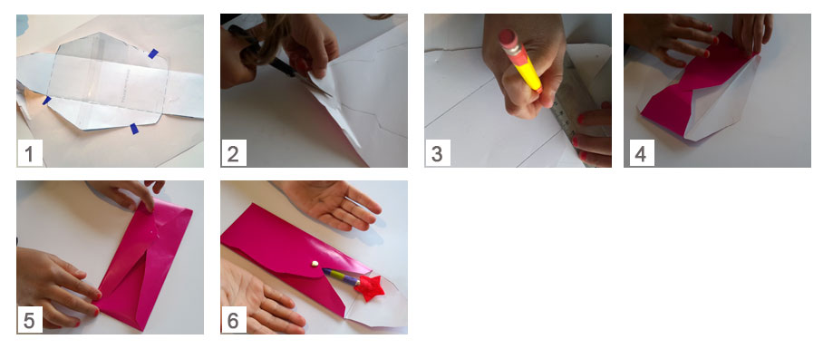 Reporter le patron sur la feuille de papier lissé (se fier aux dimensions précisées). Pour plus de solidité, et pour personnaliser l’intérieur, vous pouvez coller sur la partie blanche une feuille de papier fantaisie.