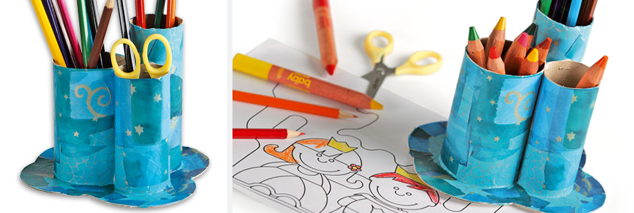 Découper des morceaux de feuilles Décopatch ou de feuilles de soie et les coller avec un pinceau et du vernis colle ou peindre le carton selon ses goûts
