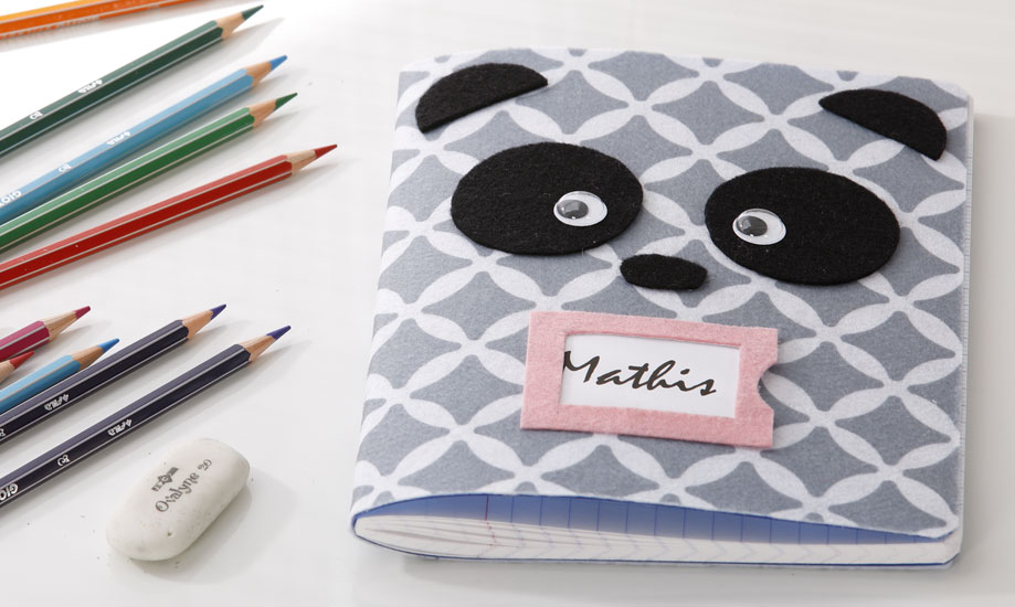 • Personnaliser le cahier en ajoutant un porte nom, fabriqué en feutrine adhésive (H: 5,5 cm - L: 7 cm).