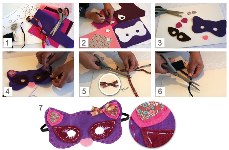Découper un peu de ruban, faire un noeud et le coudre au niveau de l’oreille du masque.