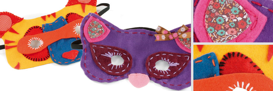 Découper les formes selon les contours, puis évider l’emplacement pour les yeux. Tracer les contours des différents éléments du masque sur les feuilles de feutrine et de tissu adhésives choisies.