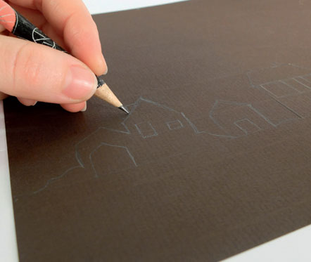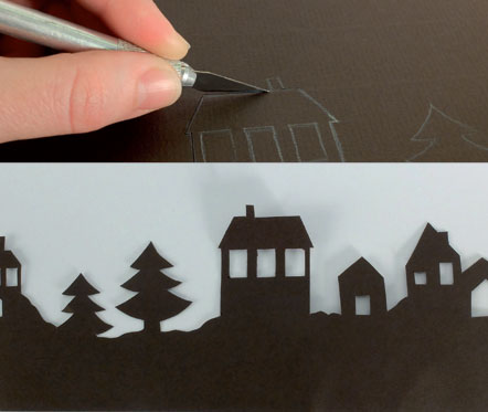 • Sur du papier de couleur foncée, dessiner un petit village. Hauteur : 3/4 du pot