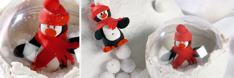 Créer le bec puis les pattes (pâte fimo rouge) et deux triangles pour les ailes (pâte fimo noire). Les coller pour terminer le pingouin.