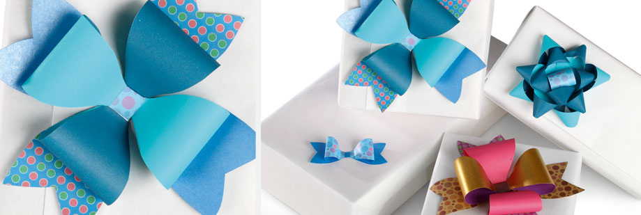 Couper 9 bandes de 1,9cm de largeur et en 4 différentes hauteur : 3 bandes de 28cm, 3 bandes de 25,4cm 2 bandes de 22,9cm et 1 bande de 8,9cm de hauteur. Adapter les hauteurs de ces bandes à la grosseur de votre cadeau pour obtenir une étoile plus ou moins volumineuse.