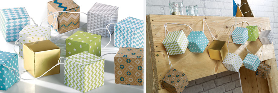 Mettre les cubes dans l’ordre voulu avant de commencer la guirlande. Percer un trou dans l’arête de chaque cube pour faire passer un morceau de cordon de satin. L’ accrocher à la guirlande en faisant un double noeud.