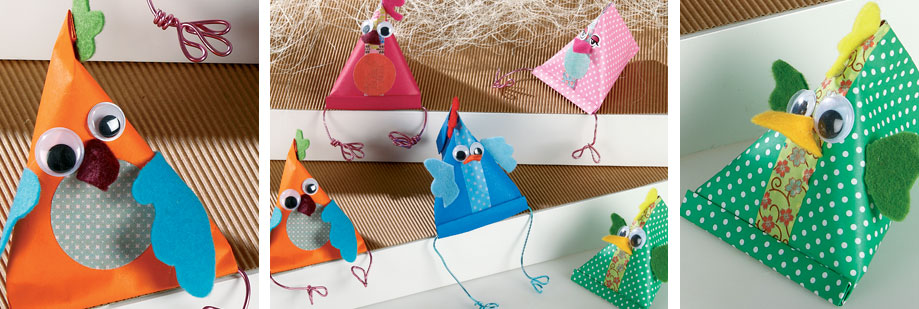 • Rabattre la partie supérieure du cône, puis y coller les différents éléments en feutrine. Pour terminer, coller les gommettes yeux.