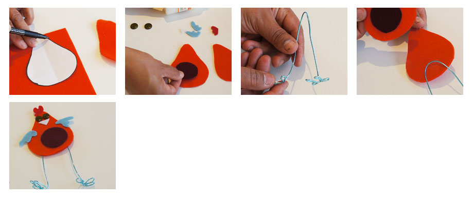 Il ne reste plus ensuite qu’à coller les ailes, la crête, le bec, ainsi que les boutons en guise d’yeux, pour finaliser cette jolie cocotte !