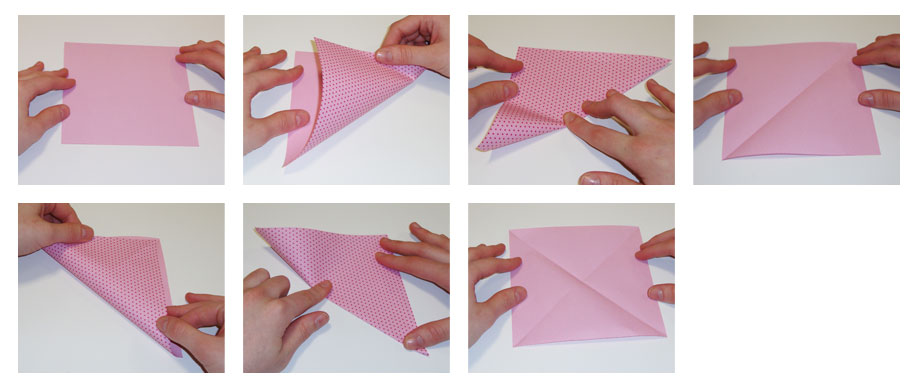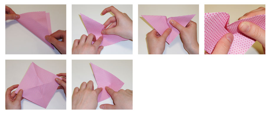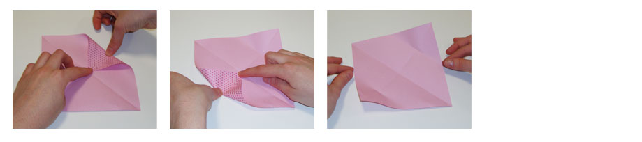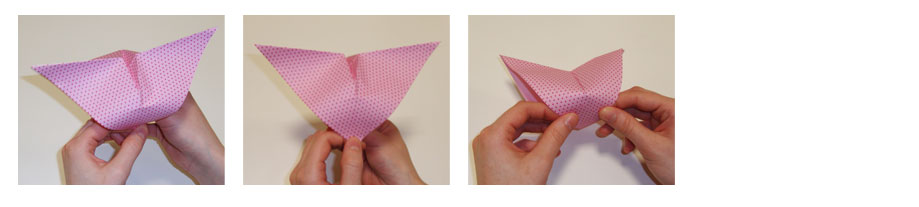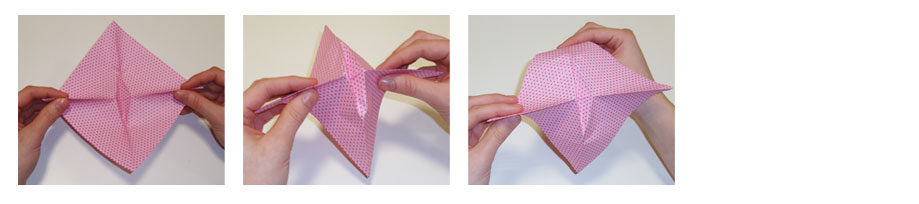 • Rabattre le sommet gauche et droit vers le centre du carré, pointer avec votre doigt le centre des côtés (sans marquer le pli) et déplier.