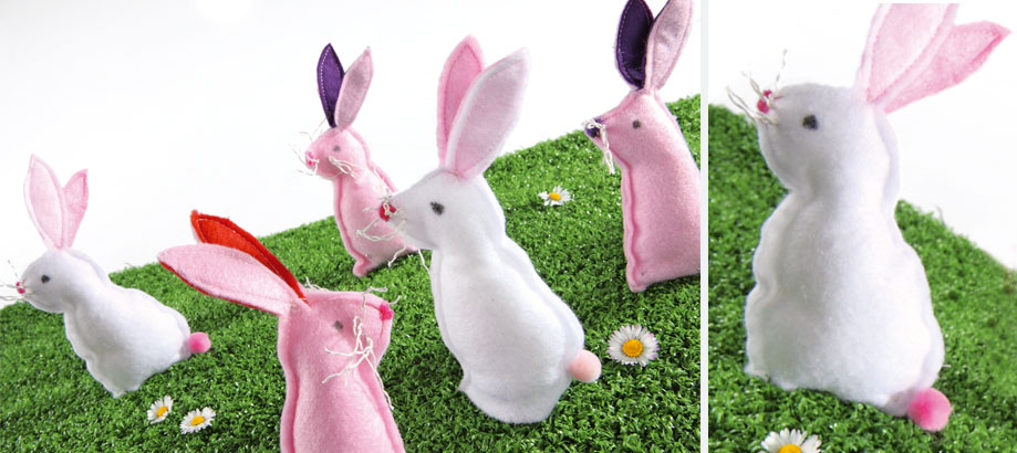 Coudre ensuite les oreilles de couleur, et le pompon pour réaliser la queue du lapin