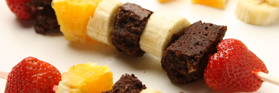 Alterner sur des pics à brochettes les fruits et les morceaux de brownie.