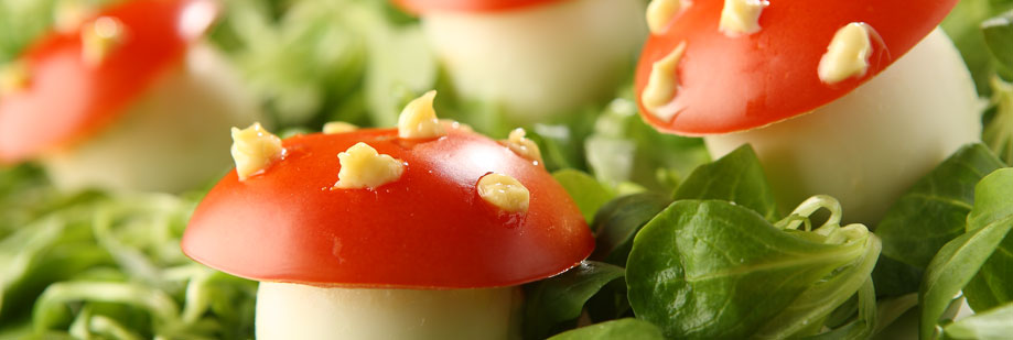 • Laver les tomates et couper un chapeau aux trois-quarts. Poser un chapeau de tomate sur chaque oeuf et décorer avec des petites pointes de crème.