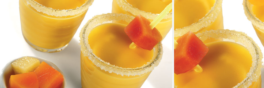 • Mettre le lait et le sucre, la banane et le jus de fruits tropical dans un bol mixeur.